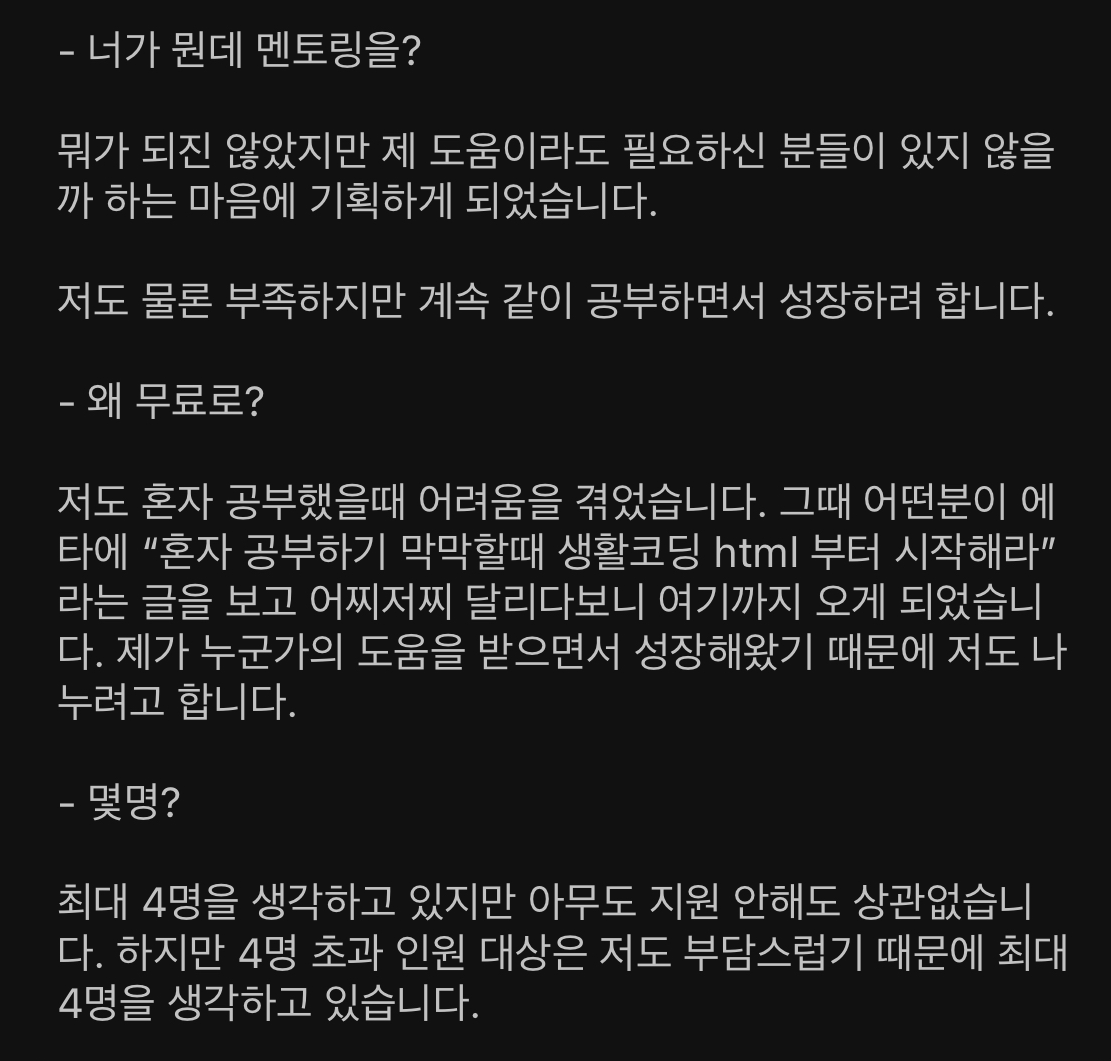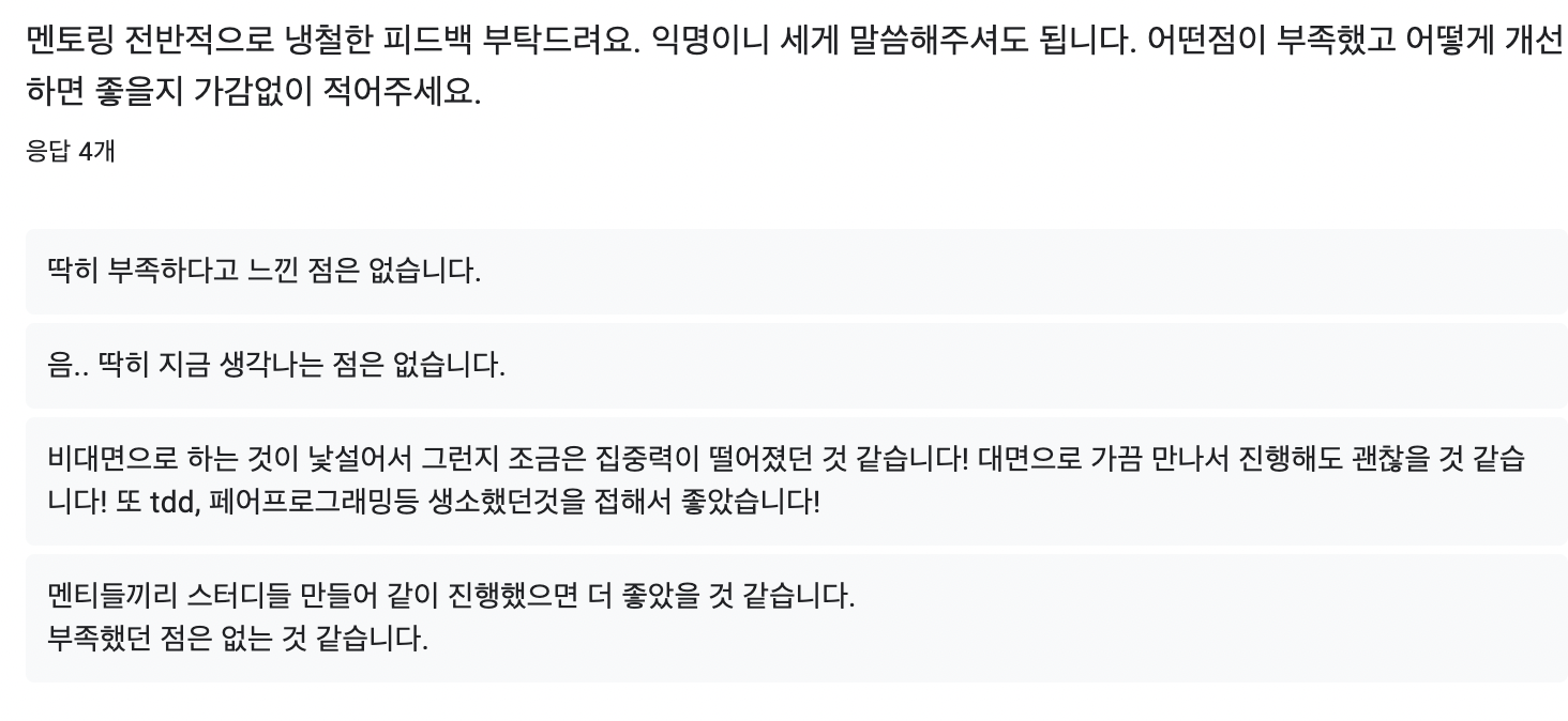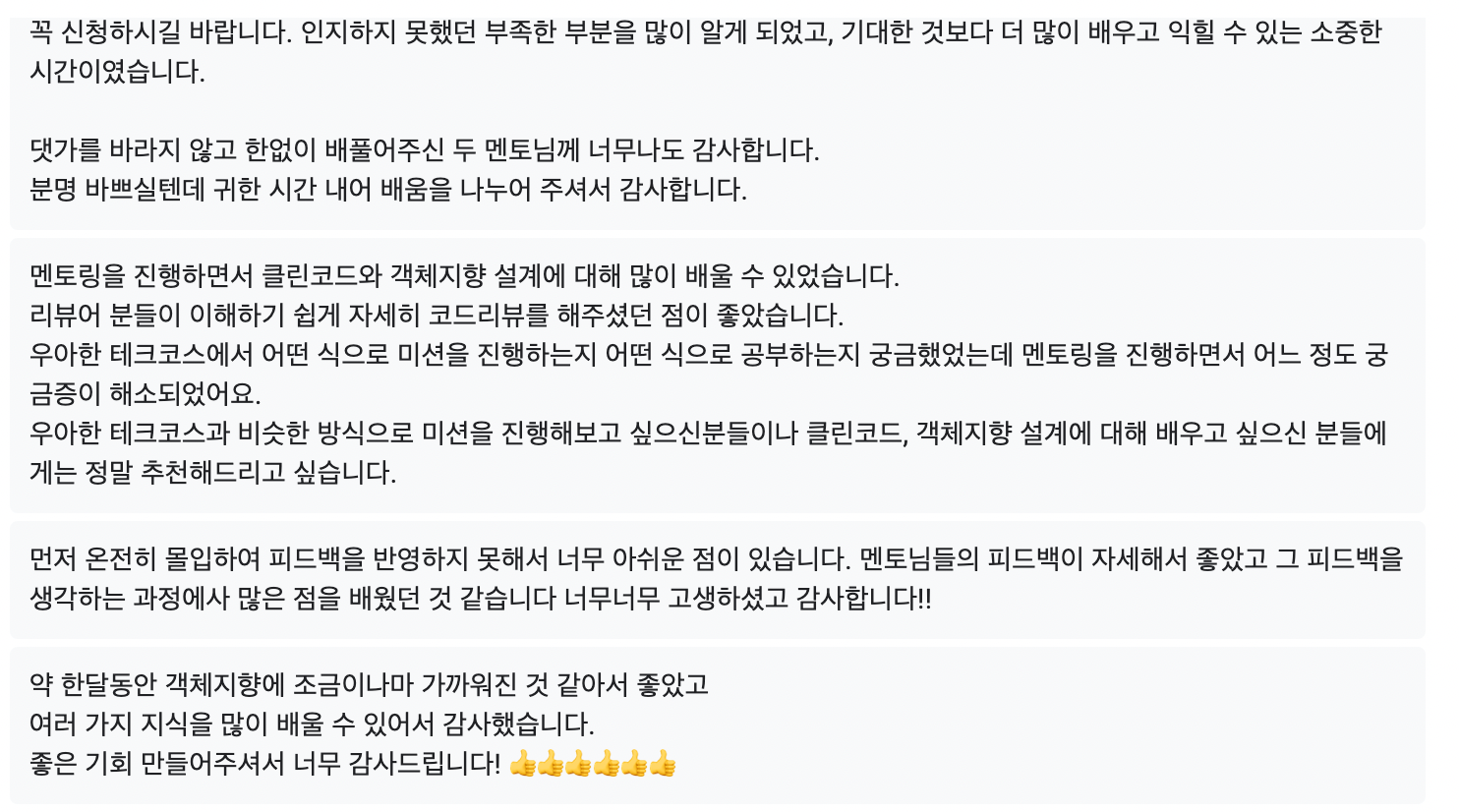 프리코스처럼 사전과제로 지원자를 받았고, 지원자 모두에게 공통피드백을 드렸다.