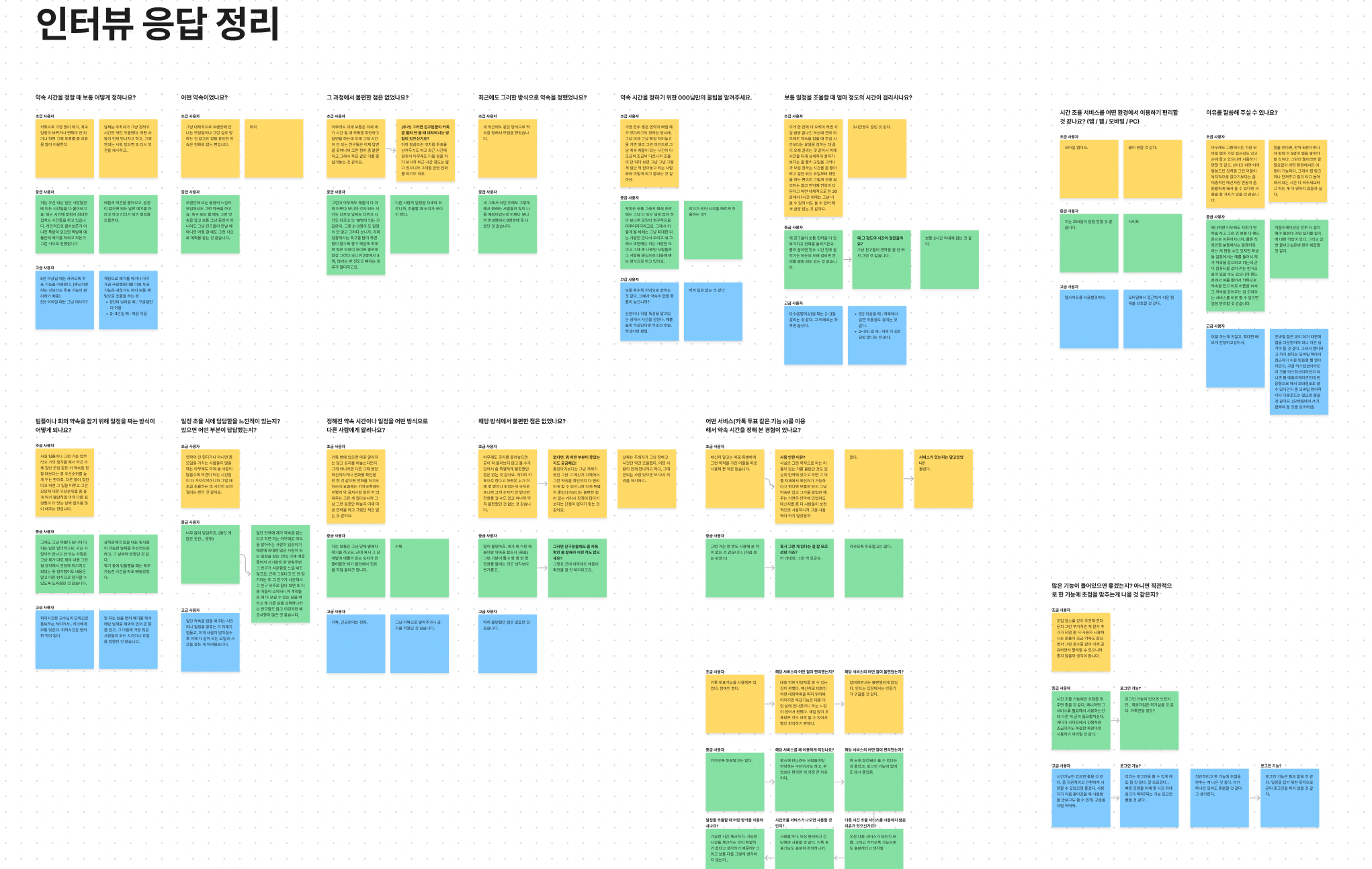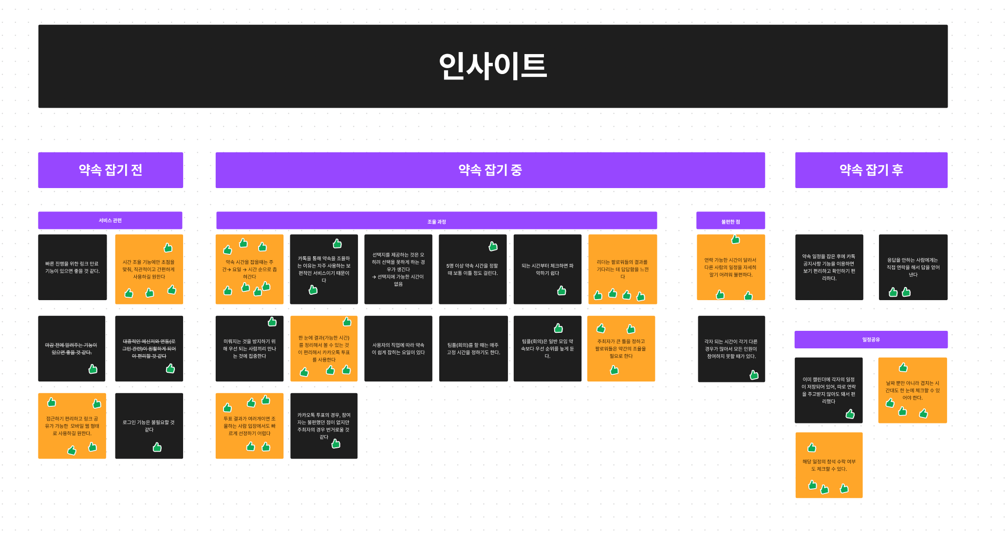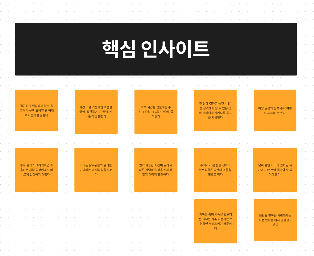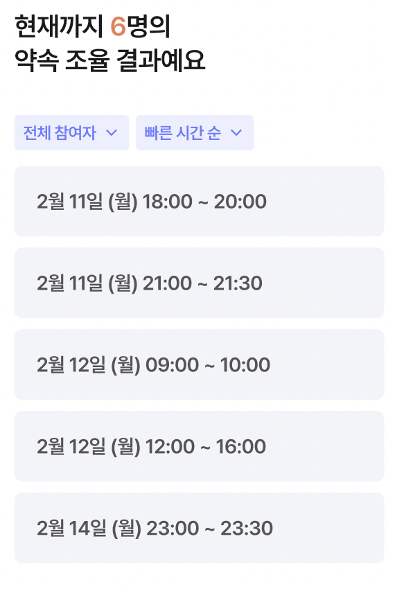 프로젝트 아이디어를 정하는 과정에서 여러가지 좋은 의견들이 나왔다. 우리는 8주라는 기간동안 완성할 수 있는지 여부가 가장 중요하다고 판단했고, 개인적으로는 실제로 사용되는 서비스를 만들고 싶었다. 시간 약속을 잡는 불편함은 당장 하고 있던 회의시간을 잡는 중에도 느꼈던 불편함이었고, 살아가면서도 시간약속을 잡아야 할 일도 많았다. 모두가 불편함에 공감하고 있었고 아이디어 채택은 수월하게 진행됐다.