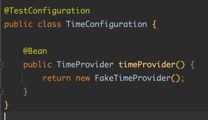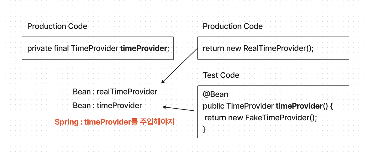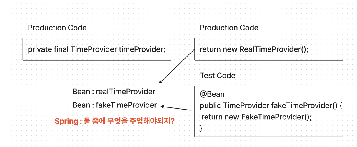 이를 해결하기 위해서는 FakeTimeProvider를 반환하는 메서드 이름을 fakeTimeProvider가 아닌 timeProvider로 바꿔야 했다. 그러면 FakeTimeProvider 구현체는 timeProvider 라는 이름의 빈으로 등록될 것이고 스프링은 이를 우선적으로 주입하게 되는 것이다. 프로덕션 코드에서는 프로덕션에 있는 하나의 Component만 빈으로 등록되기 때문에 신경쓰지 않아도 된다.