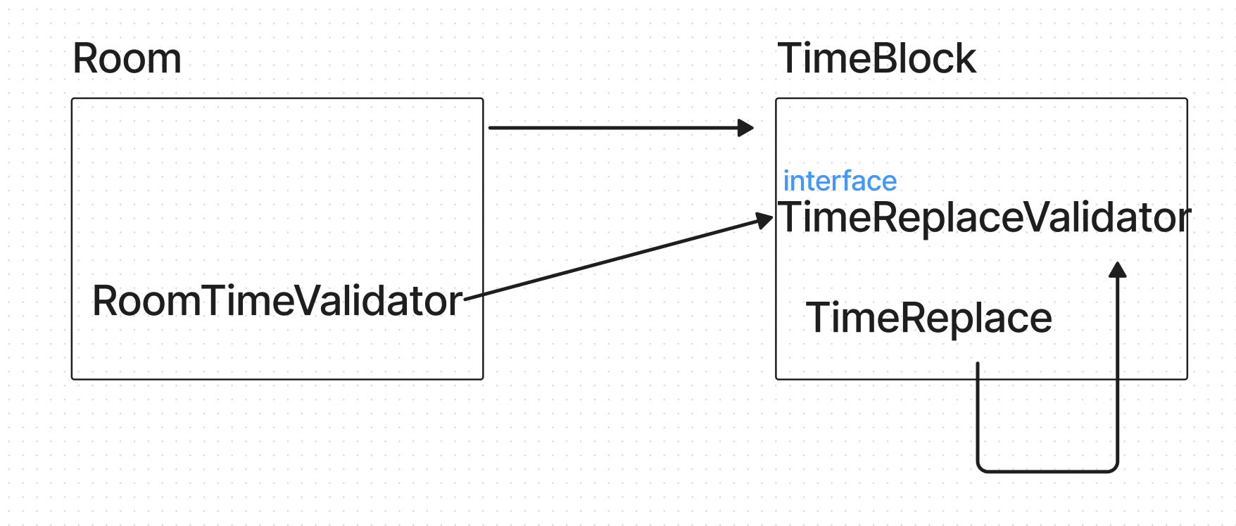 단방향 의존성을 위해서는 이벤트 뿐만아니라 인터페이스를 이용한 의존성 역전을 할 필요가 있었다. 현재 의존성 방향이 Room(방) -> TimeBlock으로 되어있다. 이 말의 뜻은 Room은 TimeBlock을 알고있어도 되지만, TimeBlock은 Room을 알 수 없다는 뜻이다.