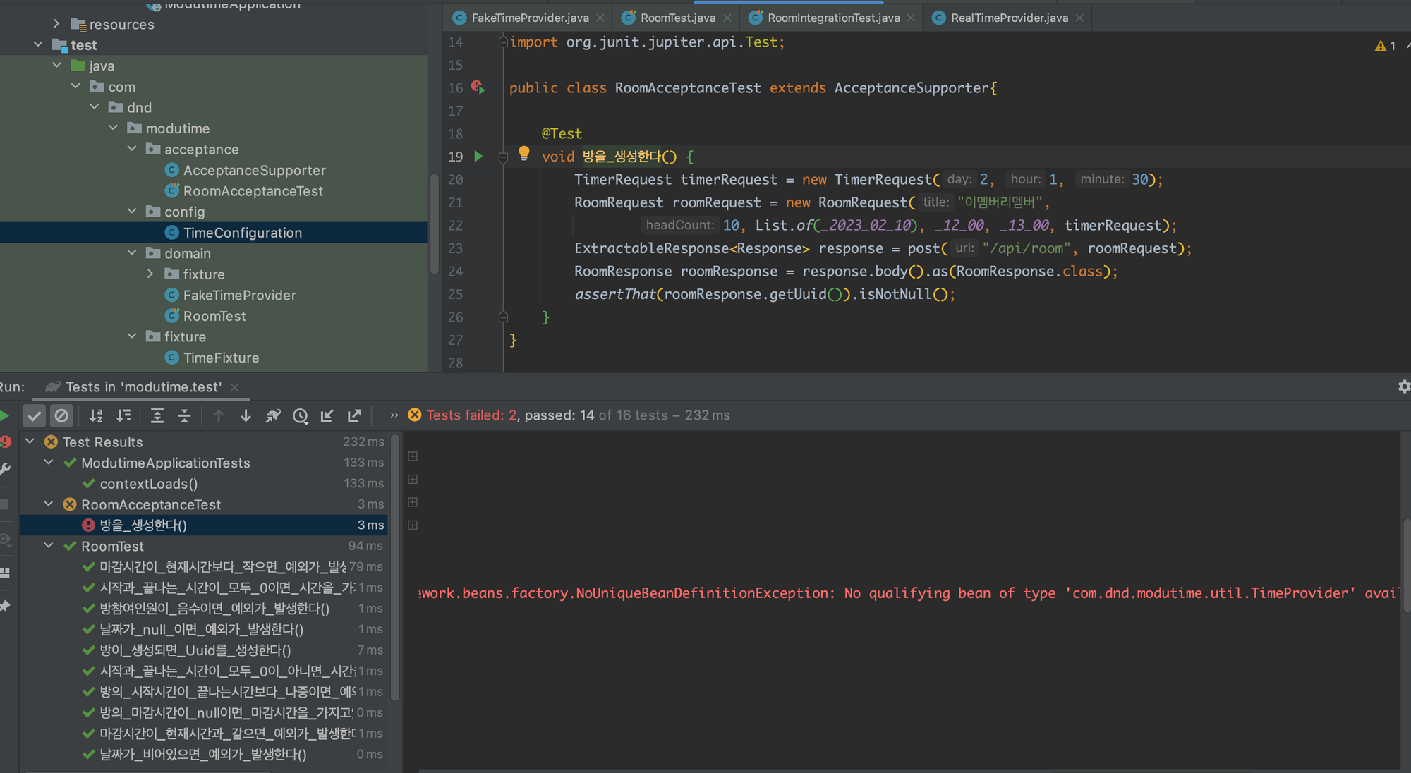 timeProvider의 구현체들 중 현재 프로덕션에서는 realTimeProvider가 컴포넌트 스캔에 의해 Bean으로 등록되었고, fakeTimeProvider 또한 Bean으로 등록되었다. 스프링은 timeProvider 라는 이름으로 관리되는 Bean을 우선적으로 주입하려 했지만 해당 이름이 없었고 다른 이름으로 2개의 빈이 띄워져있었다. 그래서 스프링 입장에서는 어떤 빈을 주입할지 모르는 상태였고 그대로 NoUniqueBeanDefinitionException 예외가 발생하게 되는 것이었다.