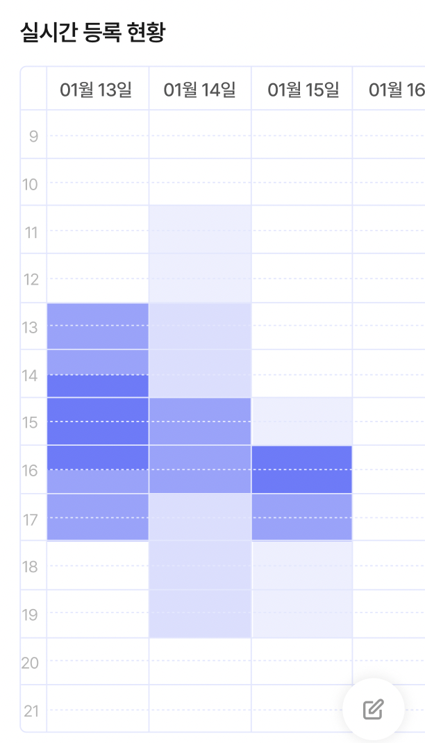 참여자가 본인의 일정을 수정하면, 그에 따라 좌)일정 등록 현황과 우)실시간 조율 현황이 바뀌어야 하는 요구사항이 있었다.