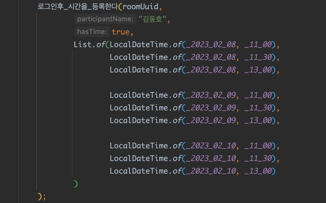 지난 번 면담시간 예약서비스를 개발했을때 가장 개선하고 싶었던 것이 시간관련된 코드의 가독성이다. 현재 테스트를 돌리고있는 현재시간이 계속 바뀌는 상황이었고, 원하는 시간으로 테스트하고 싶을때도 자유롭게 할 수 없었다. 어느 시간을 기준으로 테스트를 실행하고 있는지 테스트 코드만으로도 파악할 수 있게 만들고 싶었다. 그래서 이번 프로젝트에서는 시간관련 테스트를 최대한 가독성있게 짜서 시간테스트를 읽는 비용을 최소화하기 위해 노력했다.