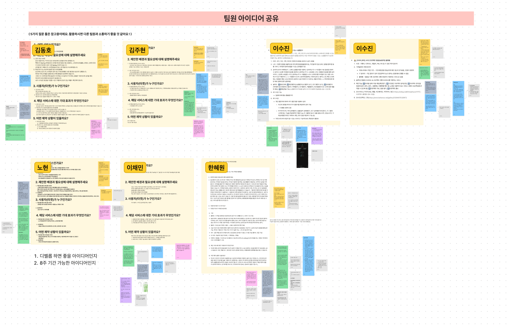 사람들의 아이디어를 다 들어보고 아이디어마다 서로 디벨롭을 할 수 있는 부분을 같이 찾아가는 시간을 가졌다. 이 때는 최대한 자신의 의견이 존중받는다는 것을 느껴야 더 좋은 아이디어를 낼 수 있다는 것을 알고있기에, 팀원들의 의견을 존중하며 디벨롭을 같이 생각해보는 방향으로 최대한 생각했었다.