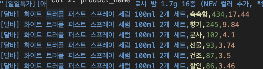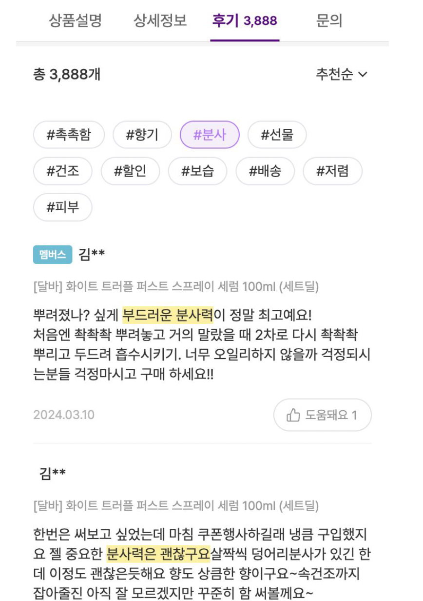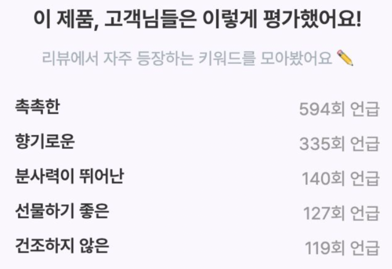 ex. 상위 3개의 키워드가 (가격이싼, 가성비, 저렴) 인 것 보다는, (가성비, 촉촉한, 향기로운) 같이 좀 더 다양한 키워드가 있다면 사용자 입장에서 제품을 파악하기가 쉽습니다.