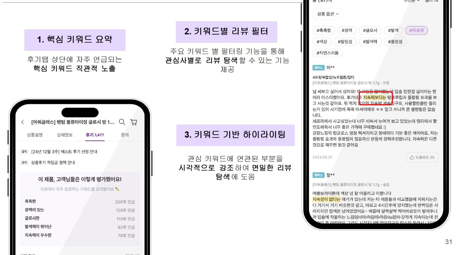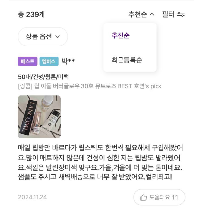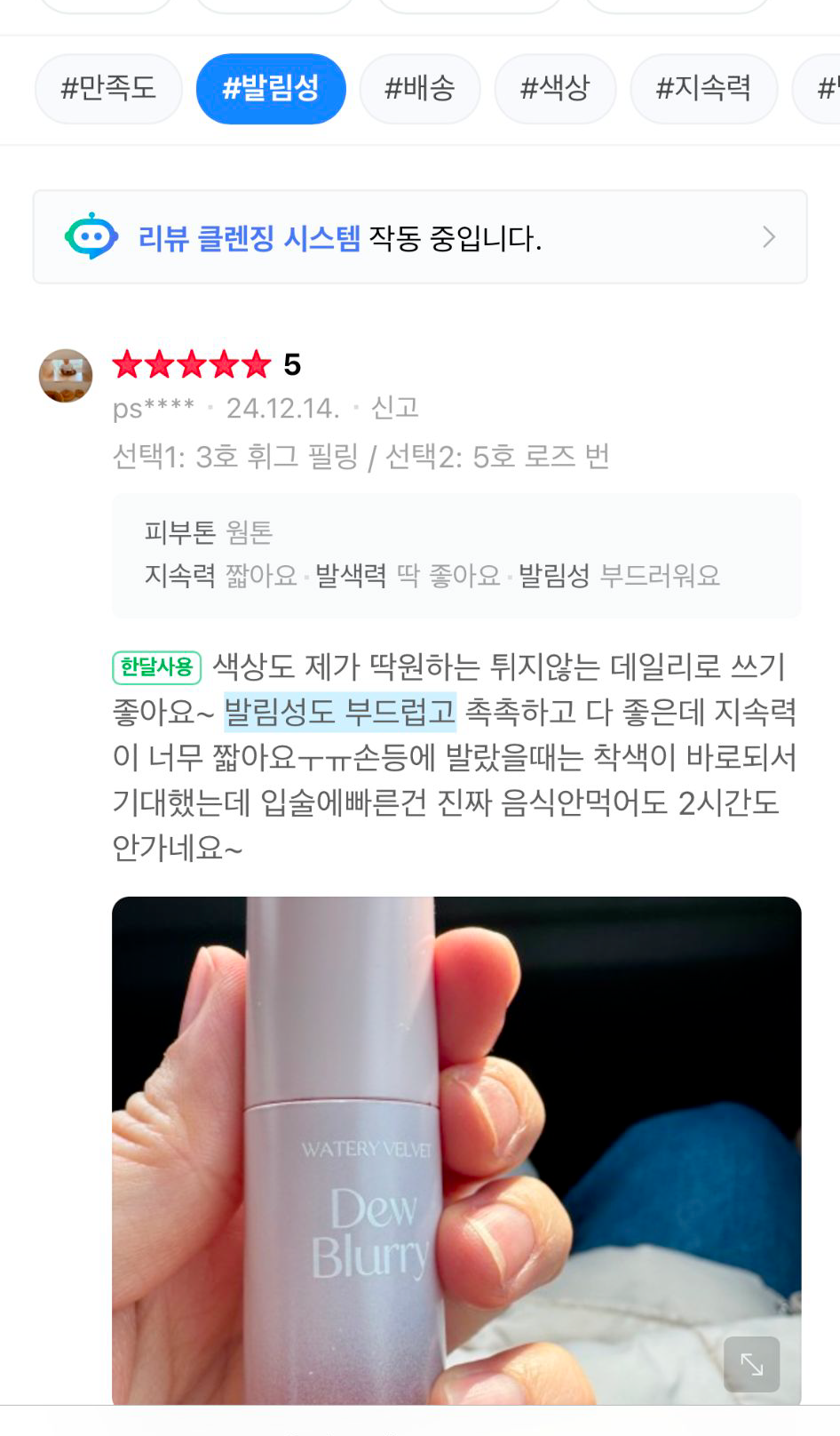 * 리뷰에 직접 언급된 내용 (예: 촉촉함, 발색력, 광택감)