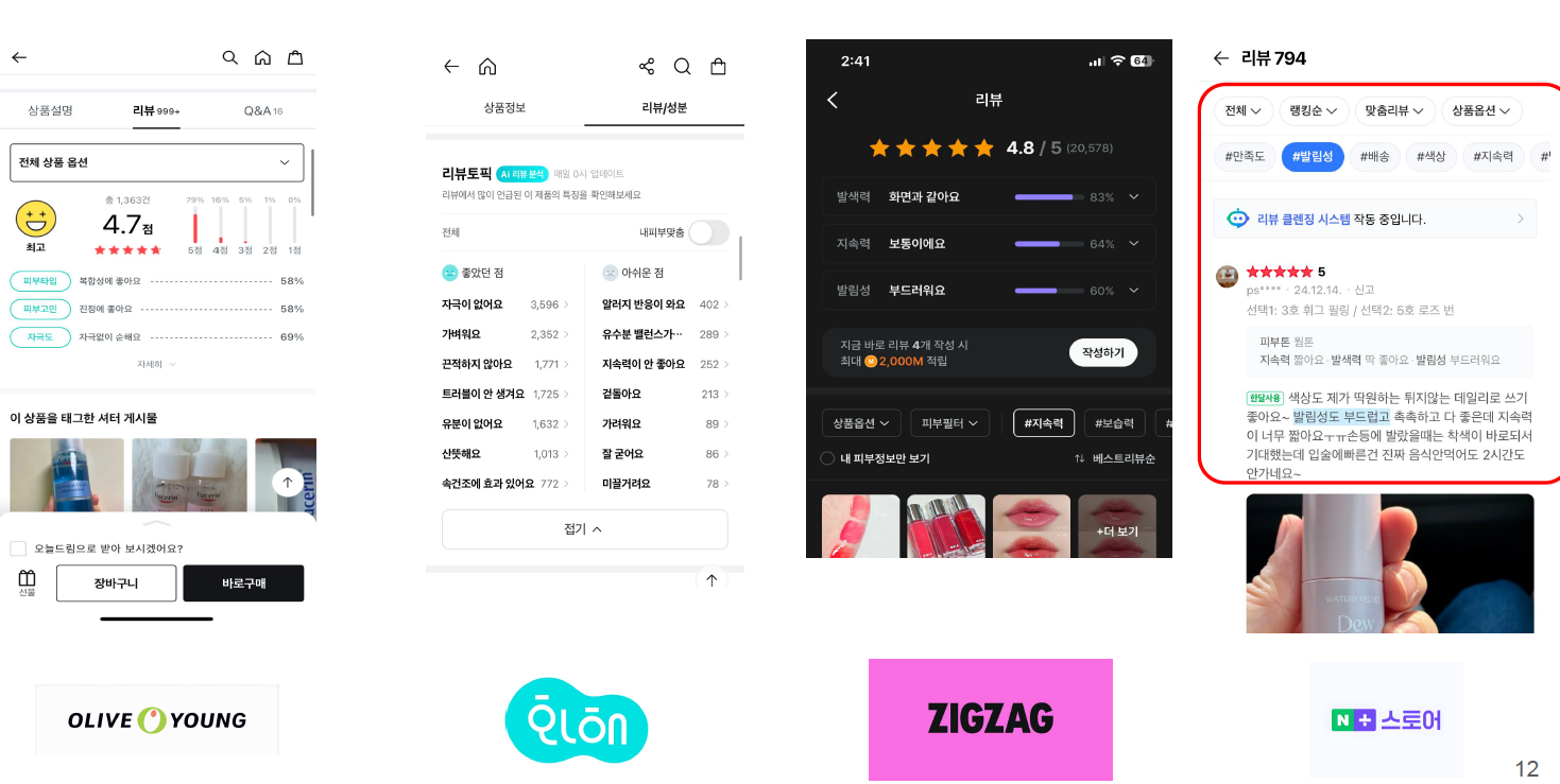 컬리의 리뷰는 아주 많은 데이터가 있지만 원하는 리뷰를 찾기에는 아직 어렵다고 느껴졌습니다. 타 서비스에서는 리뷰를 작성할때마다 어떤 부분이 좋았는지 강제로 선택하게 하여 요약된 결과를 제공하거나, 이미 있는 리뷰의 키워드들을 카운팅해서 노출해주어 어떤 리뷰가 주로 작성되어있는지 다 읽어보지 않고도 파악할 수 있게 해줍니다.