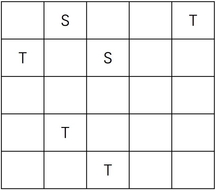 예를 들어 N=5일 때, 다음과 같이 선생님 및 학생의 위치 정보가 주어졌다고 가정하자.