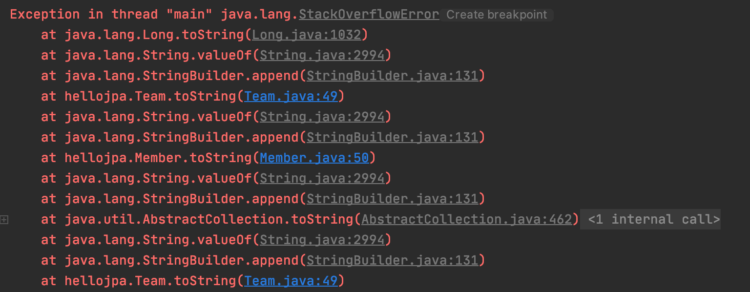(toString(), lombok, JSON 생성 라이브러리) -> 서로 계속 부름