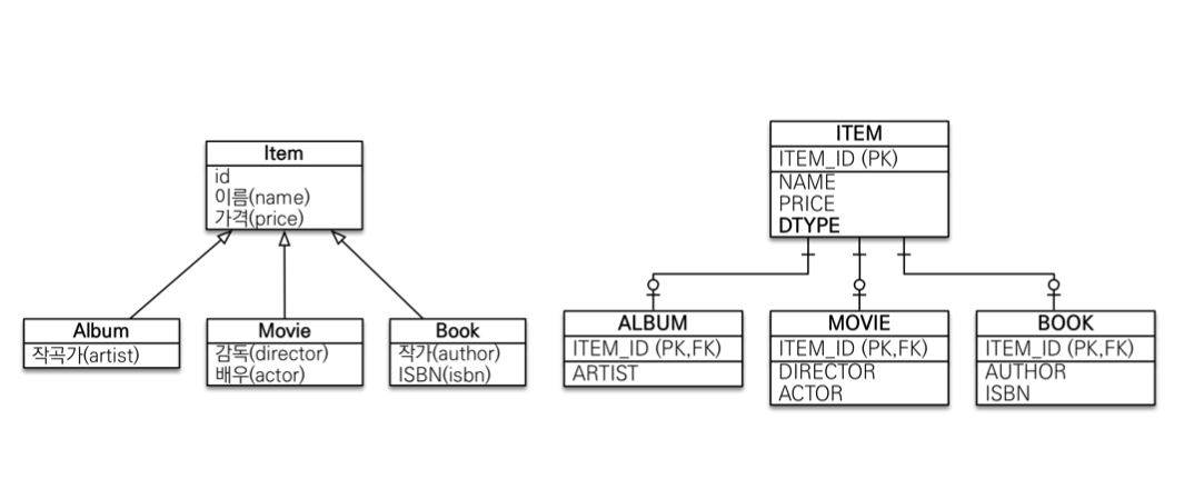 그리고 각 ALBUM, MOVIE, BOOK 테이블이 존재하고 ITEM 테이블을 상속받는다.