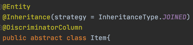 TABLE_PER_CLASS : 구현클라스당 테이블 전략 - @DiscriminatorColumn(name='DTYPE') : DTYPE 부분 컬럼 이름 지정 가능