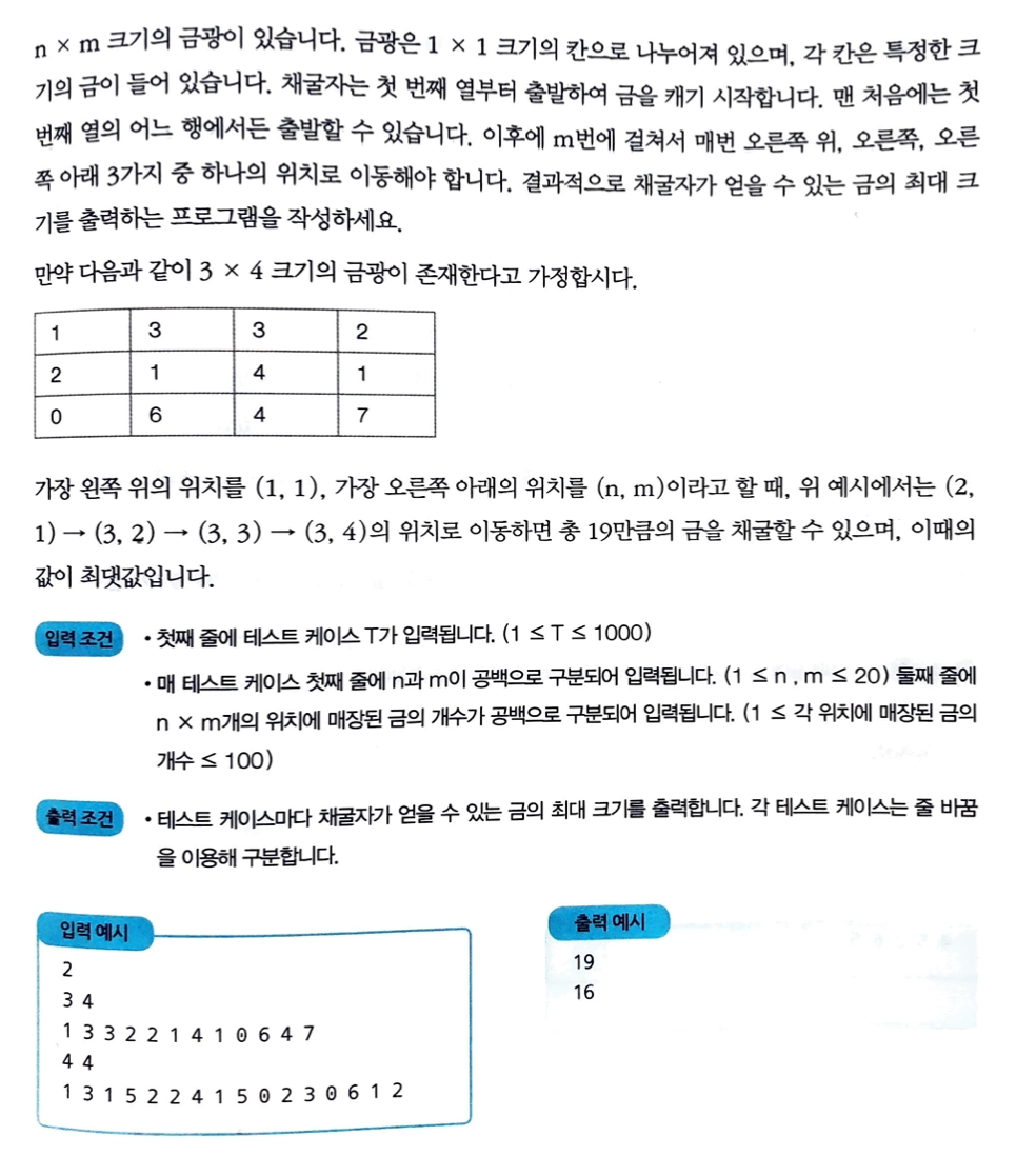 각 단계는 전 단계에서 올 수 있는 경우중에 가장큰 수 + 해당 금광수 이다.