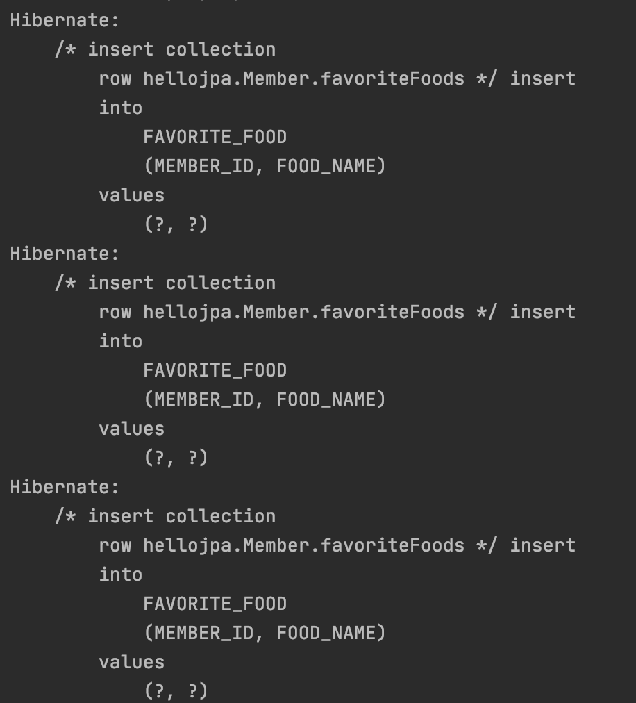 findMember를 생성할 시점에는 List, Set (컬렉션) 타입의 데이터를 가져오지 않았다가 사용시점에 insert쿼리가 날아가는 것을 볼 수 있다.