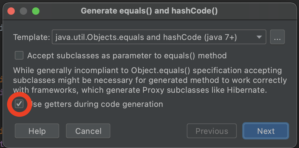 getter를 사용하도록 체크해야 프록시를 사용하더라도 equals() 가 작동한다.