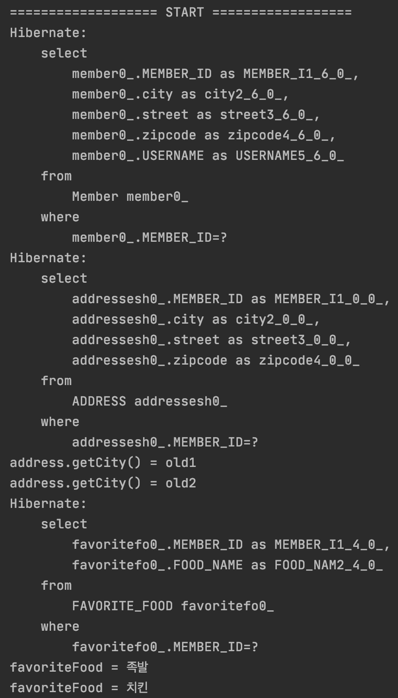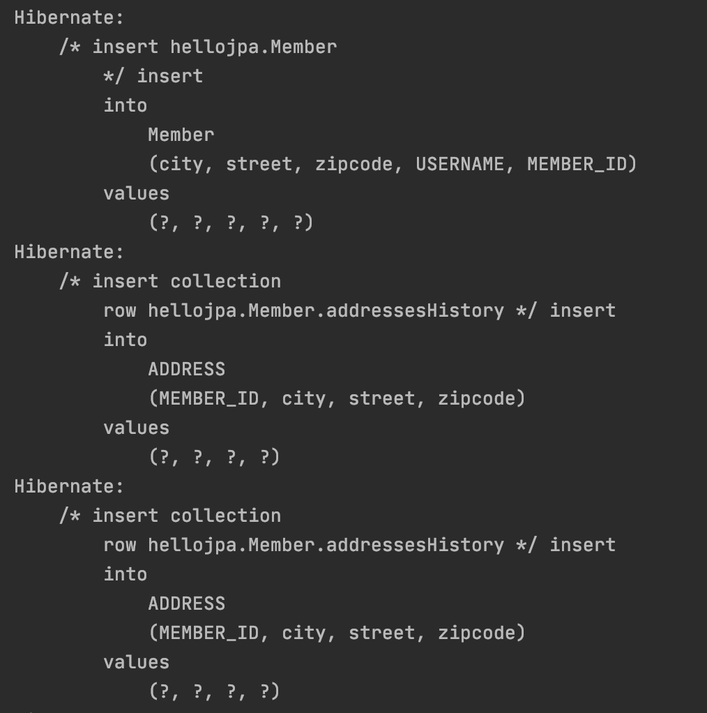 값 타입들은 엔티티에 의존하기 때문에 em.persist(member); 한번으로도 값 타입들의 insert 쿼리들이 한번에 날아간다.