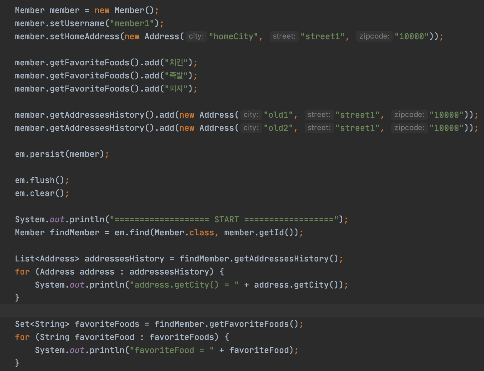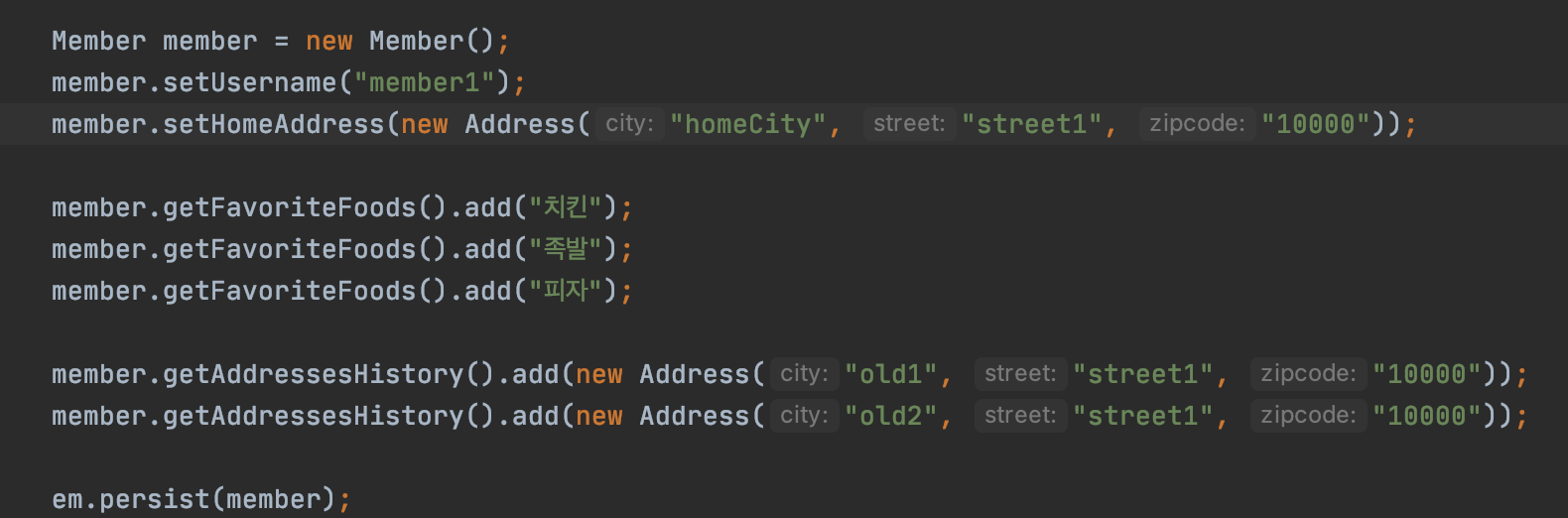 findMember.setHomeAddress(new Address("newCity", homeAddress.getStreet(), homeAddress.getZipcode()));