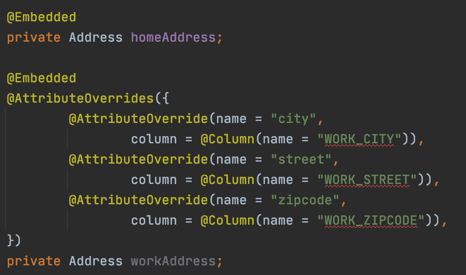 - 같은 값 타입을 중복해서 사용할 때는 @AttributeOverrides를 사용한다.
