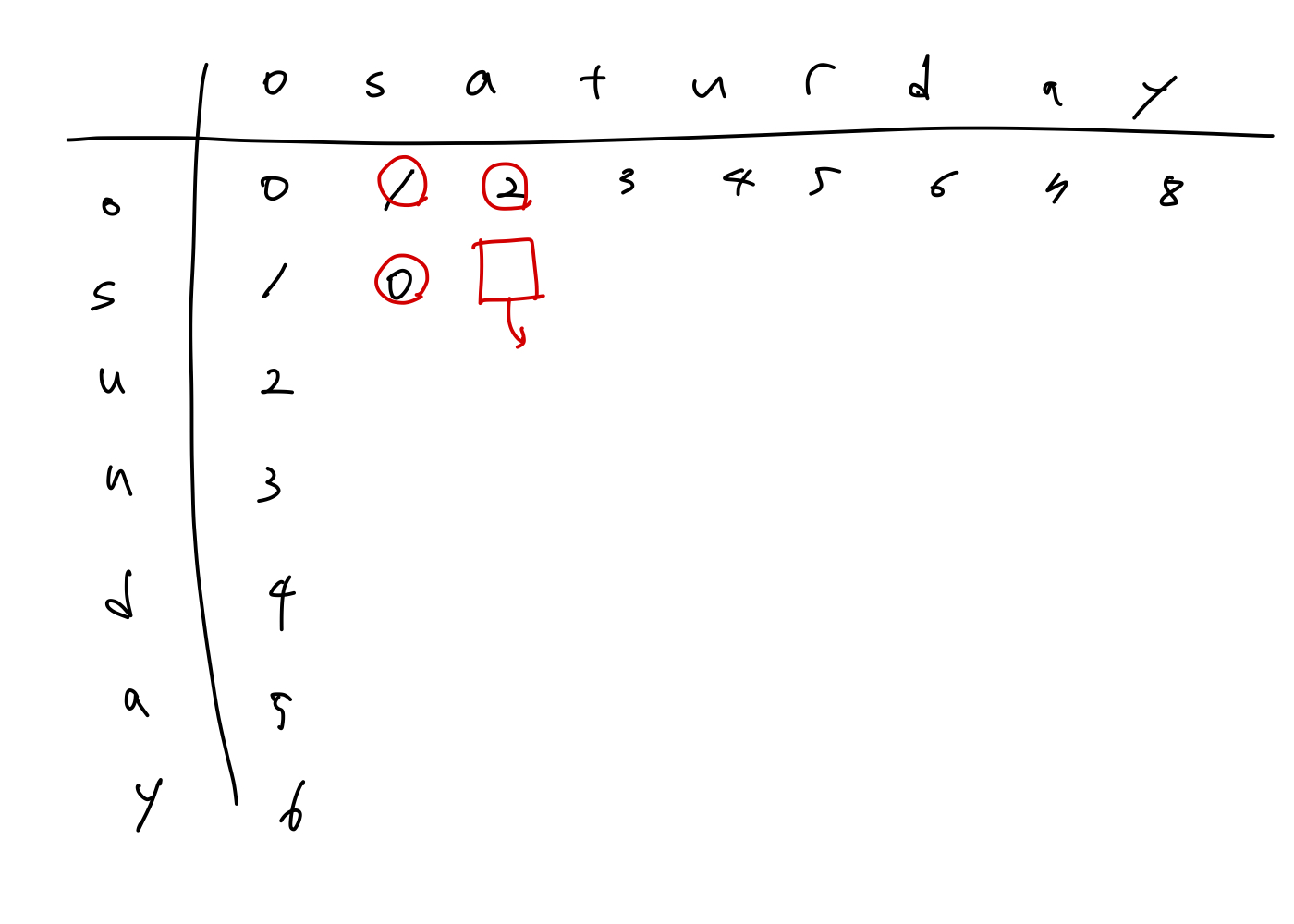 예를들어) dp[0][0] ~ dp[0][8] 까지는 0(아무것도 없는 상태에서) s, sa, sat, satu, satur, ... 로 바뀔때의 최소 편집 거리이다.