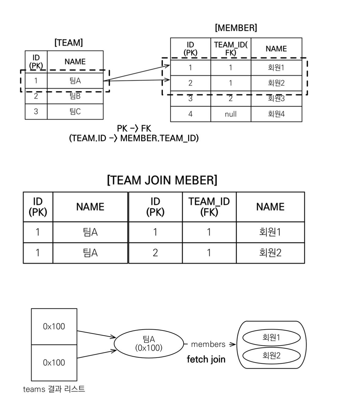 - 팀A는 처음에 쿼리가 나가고 영속성 컨텍스트에 등록된다. 그래서 2번째 팀A는 영속성 컨텍스트에서 가져와 사용하기 때문에 1개로 표현한다.