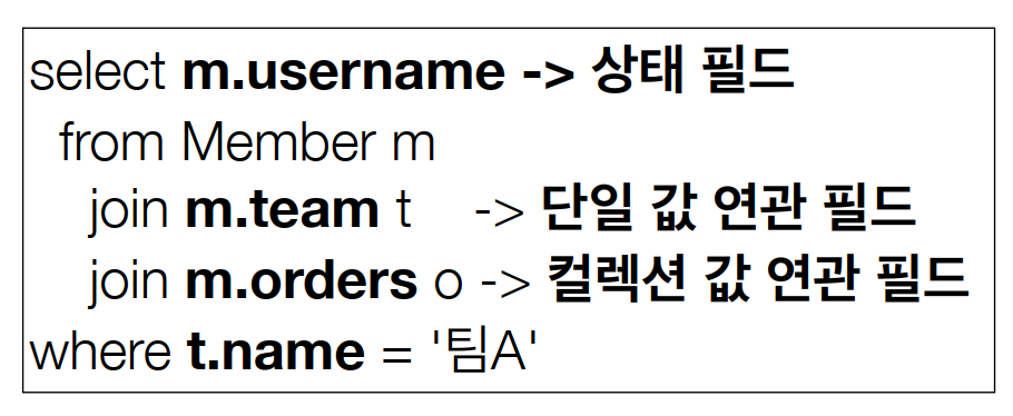 - 탐색 X (from절에서 명시적 조인을 사용해서 별칭을 얻어서 사용하면 탐색이 가능하다)