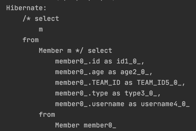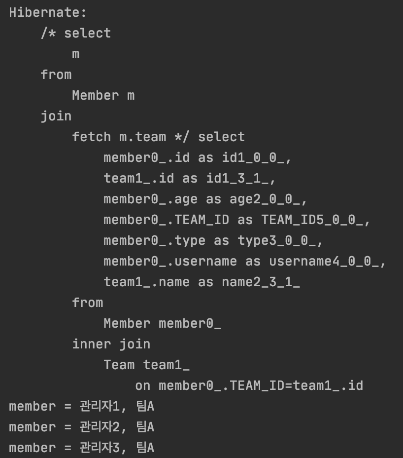 select절에 t만 있으므로 m은 당연히 가져오지 않는다. 그래서 나중에 team에서 getMembers를 할때 쿼리문이 날아간다.