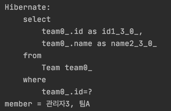 System.out.println("member = " + member.getUsername() + ", " + member.getTeam().getName());