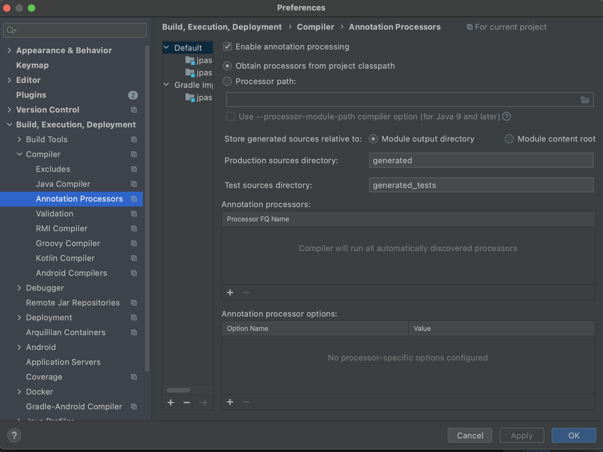 3. 설정 - Build, Execution, Deploymen - Compiler - Annotation Processosrs - Enable annotation processing 체크
